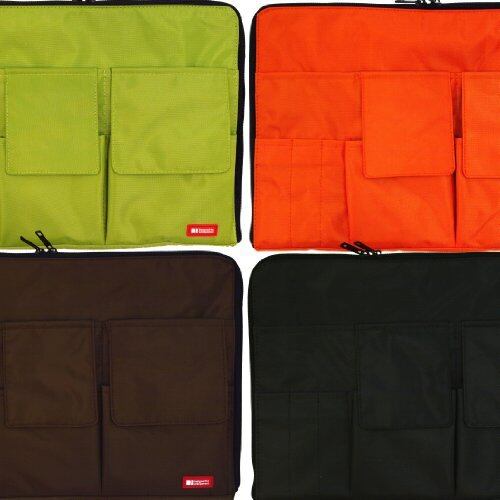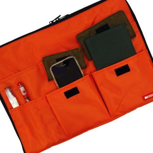 【寸法】幅350mm×奥行17mm×高さ255mm 【特徴】鞄の中でかさばらない薄型タイプ 【機能】本体にはクッション材入り 【ポケット内容】メインポケット×1(ダブルファスナー仕様)、マチなしポケット×2、マチ付きポケット×2、ペンポケット×3 【サイズ】A4 2mm厚のクッション入りで落としても安心