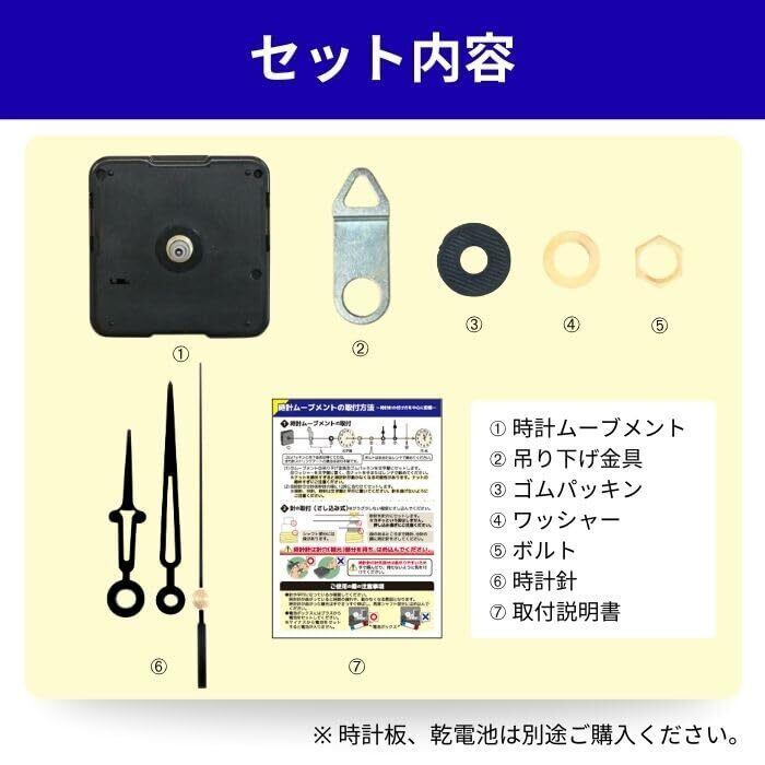 秒針が動くときに、カチカチ音が出ずにスムーズに動くスイープタイプです。 時計針サイズ;時針53mm、分針:69mm、秒針:74mm シャフト長さ;16㎜(ねじ部分8mm) 時計板のサイズが7mmまでのミドルシャフトです。 内容物;ムーブメント、時計針(時針、分針、秒針)、ナット、ワッシャー、吊り下げ金具 用意するもの;単3乾電池、レンチ(手でも取付可) ※本製品はクラフト用となります。既製品時計への使用は各メーカー様へご確認の上使用してください ※時計針取り付けの際や取り出しの際に時計針が曲がることがあります。針同士が接触している場合は、手で少し曲げて針同士が触れないように調整してください。
