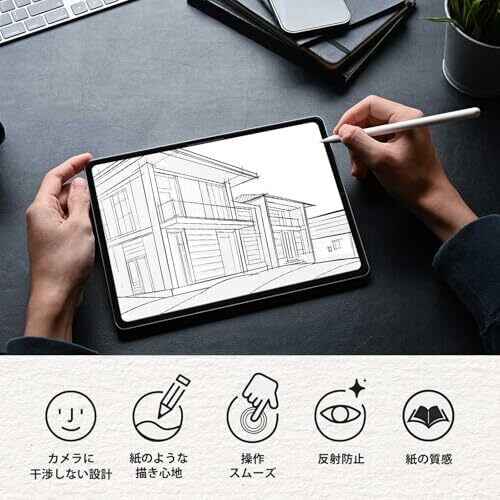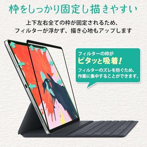 【上質紙に近い描き心地】最新素材を採用し、特殊表面形状デザインにより紙に鉛筆で描いた時の触感を実現します。紙の摩擦係数に近づけるとともに、紙に近い周波数を追及しました。 ★【着脱式】上下左右すべての枠が粘着式で何度でも着脱できる新素材を採用しています。iPadにしっかりと密着するため、タッチパネルの感度が落ちづらく、描き心地も良いです。マグネット式と比べてフィルムがズレる心配がないため、快適にイラストやメモを書くことができます。 動画を楽しみたい時などはフィルムを外すことができるので便利です。 また、外したフィルムに傷やホコリが付かないようにするための収納プレートが付属しています。 【反射防止・指紋防止】画面のチラつきを抑えるAG(アンチグレア)加工により、光の映り込みを防ぎ、目に優しく見やすい画面を保ちます。表面特殊加工によりタッチ操作をしても指紋が目立ちにくくなっています。 ★【タッチスクリーン対応】フィルムを貼ったままでも本体操作ができるタッチスクリーン入力に対応しています。 すでにガラスフィルムを貼っている場合でも当フィルムを重ねて使うことも可能です。 (ただし、2枚重ねでお使いになる場合、稀ではありますが、当フィルムを外す際、粘着部分がガラスフィルムを引っ張って剥がしてしまうことがあるため、気を付けて外すようにしてください) 【対応機種】iPad Pro 12.9インチ(2022 第6世代 New M2チップモデル / 2021 第5世代 M1チップモデル / 2020 第4世代 / 2018 第3世代)対応