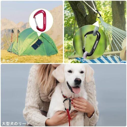 重量: それぞれの錠はたった20 g サイズ: 縦81 mm x 横47 mm(ゲート開口幅20 mm)高品質 錆止め.このD-リングカラビナは, 高級航空アルミニウム合金7075で作られています。 防錆材料ので, 野外活動に最適です。軽くて携帯便利・錆が出ない・退色しにくい・高耐摩耗性がある。汚れがあっても水で洗うだけど簡単に取れます 軽量で強い荷重1200 kgカラビナ: それぞれの錠はたった20 g の重さで, 12KN(約2645ポンド)の強度に耐えられ,強く, 頑丈でそして信頼性があります ナイス: まで, 様々なアウトドア活動で大活躍しています。光沢鮮明: 光沢感があって, 高級感が溢れて, 綺麗に見えます。複数の色セットなのでお気に入りの色を楽に選べます 家庭生活など必なアイテム: 日常生活のキーチェーン, 犬や猫のベルトフックとしても使用できます。キーホルダーとして鍵をまとめる, パスケースをカバンにつなげる, テントやタープのロープを固定する, 釣り用アクセサリー , 小さな買い物袋がたくさん持たなければならない場合もある。多目的機能: ハンモック, キャンプ、ハイキング, バックパッキング, 釣り, 旅行などに適しています。ロッククライミング&プロ登山用ロープとして使用できない 使い心地良い: カラビナの表面は滑らかで, ロープなどに引っかからないです。このタイプのカラビナはより広い開口部があって, 利用できる場合がもっと広いです。ロックしやすく, 使いやすいです。ロックカラビナの開口部には, 誤って引っ掛かることを防ぐために鋭い縁がありません。 あなたのギアを着ることを心配しないでください