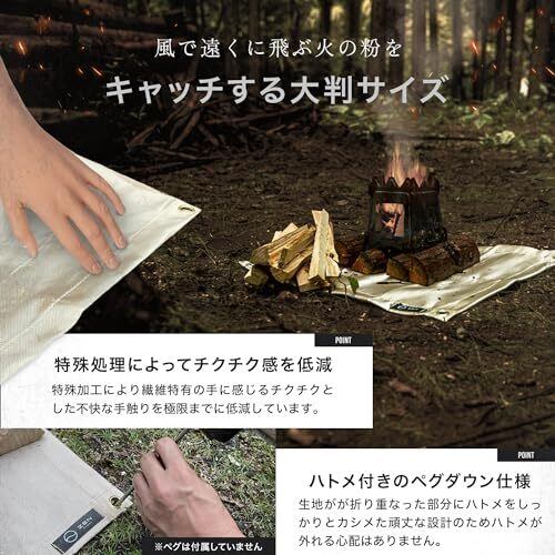 焚き火やBBQによる飛び火で地面を傷めないのはキャンプの基本マナー。焚き火台やグリル台からの飛び火等による地面の植物や地中の微生物への被害を最小限にするために是非焚き火専用シートをお使いください。 たき火時の専用シートとして開発され、耐熱温度約550℃で熱に強く、焚き火台から発生する放射熱を遮り火の粉や燃えかすがこぼれた時に地面や芝、ウッドデッキ等のダメージを軽減します。地面を焦がさず環境に配慮しながら焚き火をお楽しみください!・サイズ 使用時:約95cm×60cm 重量:約320g。 軽量で折りたためるので持ち運び時も便利です。ソロから2~3人のキャンプ向けアイテム。 素材:ガラス繊維。特殊加工によって、ガラス繊維特有の手に感じるチクチクとした痛みはなく、手触りが良いためガラス繊維が苦手な敏感肌のユーザーにおすすめです! 縫製に使用する糸も難燃性のものを使っているので糸の部分に火の粉が落ちても意図が切れることはありません。 ハトメつきなので、風が強い場合にもペグダウンできて安心。ハトメはシートが三重に折り重なっている部分にカシメられており強度が高いです。風が強い場合にもペグダウンできて安心。焚き火台だけでなく、2つに折って使用すれば卓上バーベキューグリルにも使用できます。キャンプ、バーベキュー、その他様々なシーンに使えるシートです。大活躍 、どこでも、たき火が楽しめる!火の粉から大地を守ります。 安心の日本ブランド。「品質保証」ご購入日から、1年間の保証が付いています。初期不良、欠陥品場合は早急に対応致しますので出品者連絡でお問合わせください。また、商品について何か質問や問題があれば、いつでも、遠慮なくご連絡ください。