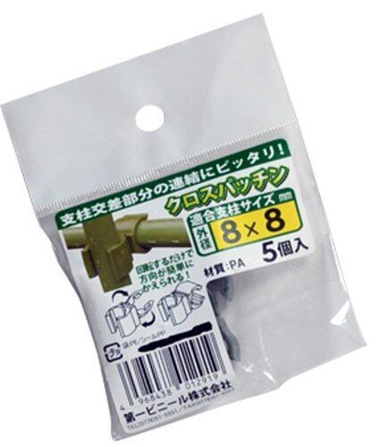 回転するだけで支柱を交差部分に連結できます。 / ワンタッチで十字、斜め支柱を固定します。 / 仕様 / 品名:クロスパッチン 5個入りパック 外径 8mm×8mm / メーカー:第一ビニール(DAIM) / 数量:5個入り / 規格:外径φ8mm×φ8mm / 主材料:ナイロン / 個装形態:袋入 / 色:ダークグリーン / JANコード:4968438012919 /