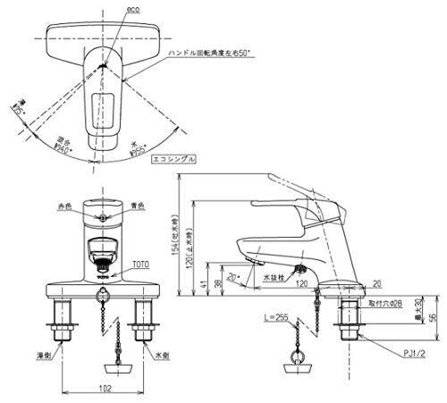 シングル混合水栓 スパウト(吐水パイプ)長さ:12cm エコシングル水栓:よく使用するレバー中央部でも水のみ吐水、また水と湯の境をクリック感で知らせ、無意識の湯の無駄遣いを防止する節湯機能付き水栓。 寒冷地向け(水抜き機能あり):内部の水が凍結膨張し水栓が破損することを防ぐための水抜きができ、逆止弁がないもの。 吐水:ソフト(泡まつ) 排水方式:ゴム栓