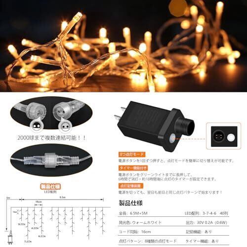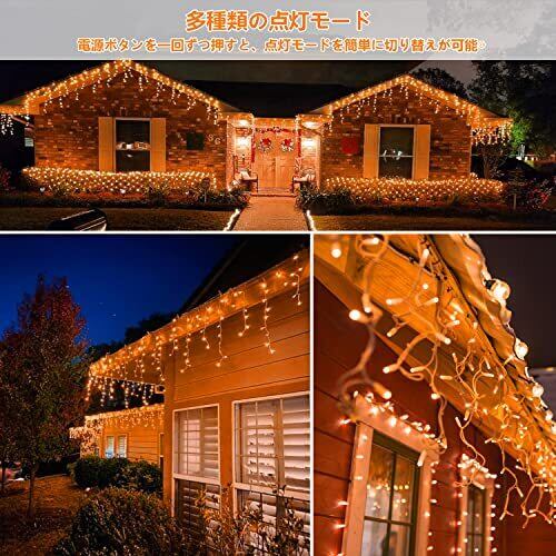 ◆【アイシクルライト】つららライトは横に伸びたコードから不規則な長さでLEDライトが垂れ下がっているのが特徴です。その特徴を活かして、建物の軒下によく使用されております。コードを伸ばすと、LED電球がつらら状に垂れ下がり真冬の氷柱が輝いているような演出が可能になります。仕様: LED配列: 3-7-4-6, 40列 ; 電球数:200球;コード間隔:16cm;発光色: ウォームホワイト ◆【多種類の点灯モード】屋外用LEDイルミネーションライトは高品質のLED電球を使用しているため、 ライトの輝度は従来品より明るいです。一粒一粒が明るくてどの方向から見ても綺麗です。完璧な360度拡散発光実現!全8種類の点灯モードがありますので、電源ボタンを一回ずつ押すと、点灯モードを簡単に切り替えが可能です。パーティー、祝日に暖かい雰囲気を作成、美しい光が広がります、お庭や玄関、お店やショッピングマーケットの扉、ベッドや壁、部屋をお好きなように演出できます。 ◆【タイマー機能で超魅力】消し忘れが心配な人や、自動で明かりを点けて防犯に役立てたい人は、タイマー機能があるものを選ぶとよいでしょう。スイッチをグリーンライトまでに長押すと、タイマーにすると点灯して、約6時間後に消灯し、約18時間後に自動点灯します。 毎日決まった時間に点灯するタイマー機能付きで便利です。華やかなデザインなので、ショッピングモールやテーマパークなどの飾りつけにもぴったりですよ。 明るくで、どんなスタイルにも合わせやすいのも魅力です。パッケージもスタイリッシュなデザインなので、ギフトにもおすすめです。 ◆【点灯記憶装置機能で快適】電源を抜いても前回のパターンから点灯するメモリー機能付きなので、消灯しても次の日も再度同じ点灯パターンで光らせることができます。お好みの点灯パターンをお楽しみ頂けます♪クリスマスツリーや庭木・樹木やフェンスへの飾り付けはもちろん、室内の装飾や結婚式・パーティーでの演出など、幅広くご利用できます。もちろん、冬だけのイルミネーションとしてではなく、年間を通したガーデンライトとしてもおすすめです。 ◆【防水・取付簡単】防水仕様で、水に濡れても心配することがないです。クリスマス、ガーデン、結婚式、パーティー、キャンプ、ハロウィン、ホテル、バー、店舗、寝室、玄関、庭、壁、舞台、学校、ショッピングモール、披露宴ツリーなどの装飾としては大活躍です。※ライト部分は防雨ですが、AC給電アダプタは完全防水ではありません。 ◆【改良・業務用に最適の連結機能搭載】オス、メスのプラグをつないでキャップを締めるだけで簡単に接続できます。同商品との連結も可能で、「ライトの長さが短い」「コンセントが足りない」など、飾り付けの”困った”を即解決するよ! 連結機能を使いこなして、より快適にイルミネーションを楽しみましょう。連結には、連結タイプごとに連結できる電気容量の制限があります。そのため、ライト同士を複数連結する際には、連結するライト全体での消費電力(W)を確認する必要があります。★最大2000LEDまで連結可能です★ ◆【多用途】ご家庭やお店、広場やパーティ会場を綺麗に彩ります。バレンタインデー、クリスマスに最適な装飾、結婚式、ホテル、レストラン、商業ビル、自宅、窓、クラブ、コンサート 、カラオケ、ファッションショー、ダンスホールなどおススメします。屋内、屋外の飾りとして、窓やベランダ、クリスマスツリーなどをデコレーション!イベントやパーティ、店舗のデコレーションにもオススメです。 ◆【品質サーピス】万が一商品に不具合があった、もしくは商品にご満足いただけなかった場合、注文履歴より出品者までお気軽にお問い合わせください。代替品あるいは返金対応させていただきます。