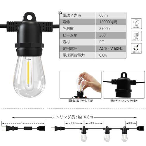 『商品仕様』ストリング長:13.8m、延長コード長:1m、ソケット間隔:0.9m、電球消費電力:0.8w 省エネ96%、定格電圧:AC100V 50/60Hz、電球全光束:60lm、色温度:2700k、ビーム角度:360º、電球数:15個+1個(付き)、ソケット個数:15個、防水等級:IP65、重量:1.14kg 『延長コード・スイッチ付き』:ストリングライトにはスイッチ付きの1m延長コードを配し、点灯しやすい。付きの連結プラグには長さ延長できます。最大30本まで連結可能。ソケット15個とLED電球16個(予備1個)あるので、電球が破損している場合は、予備の電球を安心して使用することができます。 『IP65防水タイプ』LEDストリングライトは防水型ソケットと高品質の黒いゴム電線を採用し、優れた耐寒性と耐熱性を持っている。室内だけでなく、屋外や雨の日にも利用できます。好きな場所に簡単に設置できます。 『破損しにくい・安全』電球は破損しにくい環境に優しいPC素材で作られており、ガラス電球ほど脆弱ではありません。電球色は暖かい色を演出でき、省エネのLEDを採用して、消費電力が少なく、数時間以内に過熱することはなく、長い時間使っても目が疲れません。 『多場所適用』:屋内または屋外装飾照明用の高品質ストリングライトです、ロマンチックな雰囲気と暖かいライトを作り出します。LEDストリングライトは裏庭、レストラン、ガーデン、キャンプ照明、結婚式、誕生日、クリスマスなど様々な祝日の良い照明です。
