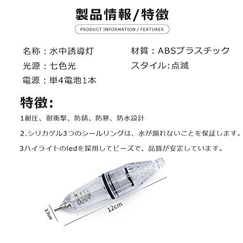 【優れる材質&CE認証】耐圧があり、透明度が高く、強度も高い、耐久性のあるPCを使用しています!CE認証を取得した安全製品。サイズ:長さ(約)12㎝ x 幅(約)2.5cm、発光カラー:レインボー、シングル重さ:20g。(単三電池別売り) 【防水効果が抜群】防水ゴムパッキンで完全防水仕様。高圧の水中に沈んでも水が染みません。長く使える。 【夜釣りに必要】夜になると、光が点滅することで、イカ アジ タチウオ イワシ シラスウナギ バス エビ など様々な魚を引き寄せます。高品質のLEDライトは水中でキラキラと輝いていて、魚を魚釣りのところに集中して、もっと多くの魚を捕獲できます。 【小型携帯に便利】彡レインボーの発光でオールシーズン、あらゆる場所や時間での釣りを楽しめます!軽量、小型、携帯に便利です。 【適用範囲】夜釣りの際に、小道具として使い、効率よく釣りを楽しむことができます。男性、家庭用のサバイバルギアへの贈り物で、緊急サバイバルキット、釣りサバイバルキット、ハイキングキットに最適です。