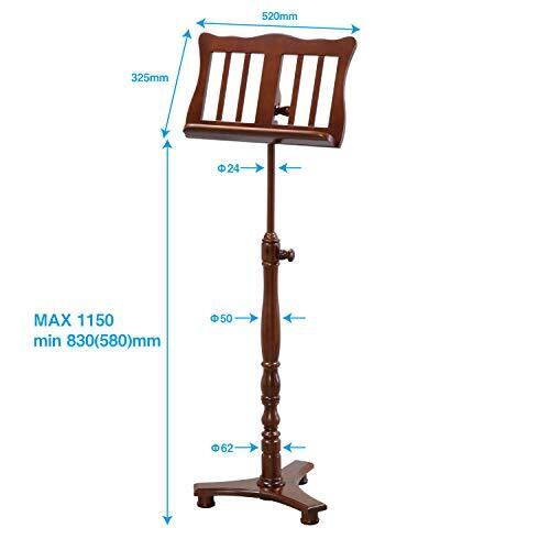 木製譜面台 (組立式) 高さ:最高 1,150mm、最低 830mm (パーツを1個抜くことにより、580mm迄下がります。) 譜面部サイズ:幅 520mm、高さ 325mm 重量:4.1kg カラーバリエーション:BRO (茶色)、WHT(白色)