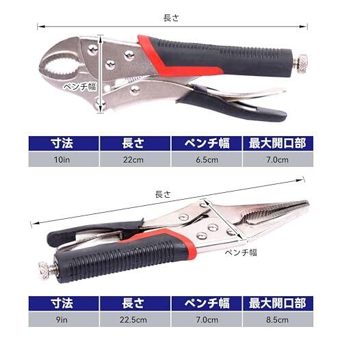 【素材】クランプ刃口は50CrV、ハンドルは35鋼製。 製品の表面は熱処理され、硬度が高く、寿命が長いです。 【サイズ】セットには、9インチ、10インチの2点のサイズの製品が含まれています。手作りのDIYの異なるシーンの使用に満足します。 【丈夫で耐久性】高品質の鋼で鍛造され、高温で焼入れされているため、高硬度と強トルクの特徴があります。 トングヘッドとクランプボディの間にリベット留め加工を採用し、しっかりとした耐久性を実現。 【調節可能な開口部】円形の刃口を使用して、開口部のサイズを調整し、クランプ対象物が変形しないようにすることができます。 クランプ本体は電気メッキで処理されており、防錆効果が高く、見た目も美しいです。 【用途】家の修繕、パイプライン修理、ワイヤーカットなどで広く使用されています。クランプ部品のリベット打ち、溶接、研削などに広く使用されており、作業効率が向上するだけでなく、経済的です。