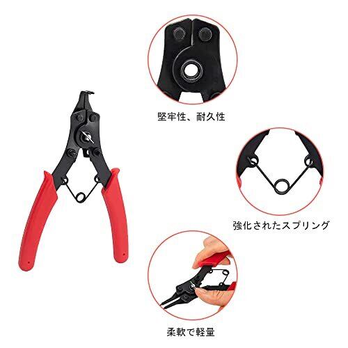 【パッケージ内容】本体*1、交換用ヘッド*4。サイズ:140*130*13mm。 【4タイプのヘッド 】それぞれ先端の角度が180度2個、45度1個、90度1個。必要に応じて4種類のクランプヘッドを自由に交換できる。 【素材】ペンチは高炭素鋼でできており、耐久性が向上しています。良質なゴム製の滑り止めハンドルを採用し、人間工学の理念に符合し、滑り止めが丈夫で、握り心地が快適で滑りにくい。 【軸・穴用】差し換え位置の変更や、先端のアタッチメントの交換することで、軸用としても、穴用としても使用できます。 【幅広い用途】これらの4ピースのペンチセットは、主に、保持リング、スナップリング、サークリップの取り外しなど、さまざまな特殊な接続クリップの取り外しに使用されます。