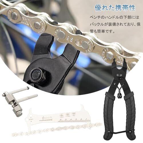 【セット内容】ミッシングリンク 工具x1個 、チェーンカッターx1個、 チェーンチェッカーx1個、数量:3個セット、重量:約348g。 【ミッシングリンク 工具】チェーンの取り外しに特化したツールが作業をより簡単で、鉗子には良質のスプリングが付いており、てグリップが握りやすく簡単、チェーンを取り外すのがより便利で迅速である。 【チェーンカッター】6-11速度ですがの自転車チェーンにしか適し、ほとんどの自転車に使用可能です。チェーンカッターは高品質な金属素材を使用しており、チェーンをスムーズにカットできます。メンテナンス作業をより効率的で便利にします。 【磨耗検出尺】磨耗検出スケールツールには0.75%と1%の2つの測定目盛りが付属しており、チェーンの摩耗度を正確に測定し、いつチェーンを交換すべきかを明確に把握することができます。 【優れた携帯性】自転車工具セットはコンパクトなサイズで、工具箱に収納することができ、外出時にも持ち運びが便利です。ペンチのハンドルの下部にはバックルが装備されており、保管も簡単です。