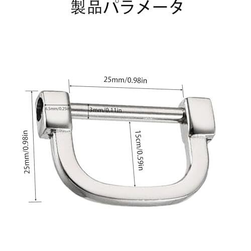 【製品仕様】内部幅: 25mm; 内部高さ: 15mm; 厚さ: 3 mm。 【合金素材】高品質な合金素材を採用しておる防錆性。 【インストールが容易】取り付けは簡単で、いつでも分解できます。ドライバーで締めることができます。 【高級感】上品な質感は高見えます。シンプルなデザインで色んなアクセサリーと組み合わせやすいです。 【ハンドメイド作品について】鍵やその他の物品を日常生活の中で管理し分類するのに最適です。キーホルダーや携帯ストラップを作ったり、小袋やバッグ、鍵ペンダントにハンドルを取り付けたり、手提げ袋やひも取り袋などの工芸品を作ったりするのに使えるので、DIY生活を充実させてください!