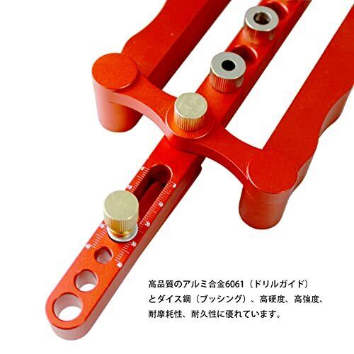 【サイズ】ブッシ及び位置決めピン:6mm、8mm、10mm。17mm~60mmまでの異なる厚さの木板に対応、調整することを可能します。 【素材】高品質のアルミ合金6061(ドリルガイド)とダイス鋼(ブッシング)、高硬度、高強度、耐摩耗性、耐久性に優れています。 【ユニークなデザイン】両側には波のような形ですが、滑りにくいです。家具工場と木工愛好家に適応なツールです。 【用途】ダボ穴開け、ネジ穴、ボルト穴などに使用します。 【使用】ほぞ穴作業、位置決めピンの穴あけに適な工具です。
