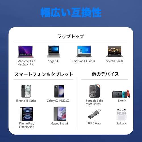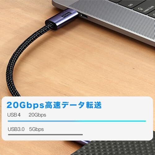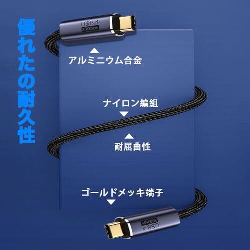【20Gbpsデータ転送&8K映像出力】USB C to Cケーブルが最新のUSB4.0技術を採用、Thunderbolt 3対応、理論的にデータ転送速度は最大20Gbpsまで達せます。HD映画を20Gbpsのハイスピード転送により、数秒で転送できます。ご注意:20Gbpsは理論上の最大転送速度ですが、実際の速度はパソコンや線材などの影響を受けますので、実際の伝送速度を基準にしてください。注:Type Cスマホを使用する場合、本体はDP Alt機能に対応する必要があります。 【100W急速充電】USB Type-cケーブルは最大20V/5A (100W)まで安全かつ安定して出力できます。自宅用、職場用、旅行用などいろんな場所で大活躍しています。▲充電器と接続する機器がPD対応している場合に限ります。※ご使用のデバイスにより供給スピードが異なります。 【安全な保護機能搭載】優れたE-Markerスマートチップ,最も安全な100Wの急速充電を実現する最先端のスマートチップです。過充電、発熱と短絡を防止するE-markerスマートチップを搭載し、安定性の高い急速充電と大切な機器の損傷防止を実現します。 【優れたの高耐久性】3重に編み込まれた高耐久ナイロンを採用、ケーブルの強さと柔らかさを両立し、コード部分はねじれや折れに強く、断線しにくい。10,000回以上の曲げ試験と10,000回以上の指抜き試験にに合格しており、耐久性にとても優れております。 【幅広い対応性】USB-Cに対応したスマートホン、ノートパソコン、タブレット、ゲーム機及びその他のデジタル端末に対応します。MacBook Pro 14" 2021、MacBook Pro 16"、MacBook Pro 15.4"、MacBook Pro 13.3"、MacBook Air 2018-2020、MacBook 2015-2017、iPad Pro 2018-2020、iMac(2020)/iMac Pro/Mac mini(2018)、Surface、Xperia、Galaxy、Pixel等タイプc機種対応。