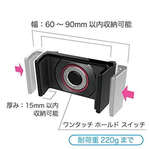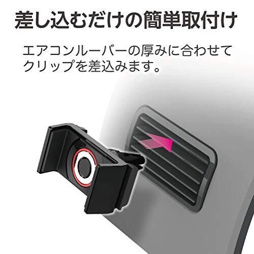 専用クリップでエアコンルーバーに差し込むだけで設置可能 スマホで押すだけのワンタッチホールド機構 幅60mm~90mm・厚み15mm・耐荷重220gのスマホに対応