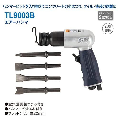 ハンマービットサイズ:0.401mmパーカーテーパー 空気消費量:170L/分 最大使用圧力:0.59MPa 打撃数:5000打/分 フラットチゼル幅:20mm