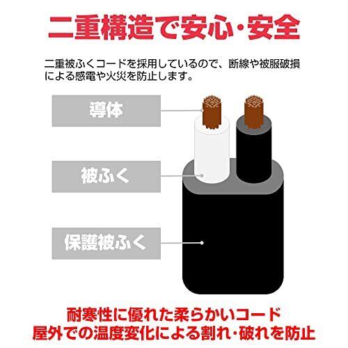 【3mの延長コード】耐寒性に優れた、屋外で使える、柔らかい日本製の延長コードです。 【屋外で使用可能】防雨加工なので屋外で使用できます。 【日本製の延長コード】安心のMade in Japanです。 【2芯タイプ】二重構造で安心安全です。 【商品詳細】・仕様:S-VCT2c×1.25㎟ ・定格:125V-15A 1500W ・質量:0.4kg ・3m