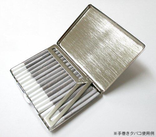 本体サイズ:102×12×76mm 本体重量:100g 素材・材質:真鍮 原産国:中国 スーパーキングサイズ(100mm)(ロング)/ 70mmレギュラーサイズ(手巻きタバコにも) 100mm:9本収納/ 70mm:12本収納 タバコをバラして収納するタイプのシガレットケースです。ロングタイプのスーパーキングサイズ(長さ100mm)のタバコが9本収まります。また 収納の向きを変えると、レギュラーサイズ(70mm)が12本収納できます。手巻きタバコの持ち運びにもぴったりお使いいただけます。