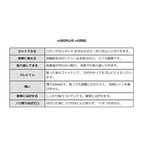 +GRIPLUS+(グリップラス)は、貼るだけで、滑りを止める簡単滑り止めシールです。【日本製】 はがした後もノリがほとんど残りませんので、べたつきを心配する必要がありません。 【特長】カットできる・簡単-貼ってフィルムをはがすだけ・貼り直しできる・ズレにくい・薄い(1mm以下)・簡単にはがせる 【上手な使い方】・貼り付ける先の素材と形を確認してください。・貼り付ける前にキレイに掃除してください。・貼り付けた後、少し時間をおいてください。・角に少し丸みをつけてください・表面フィルムをはがしてください。 【ご注意】貼る対象の素材によっては、貼れなかったり、すぐに剥がれる場合があります。セロファンテープを、何度か貼ってはがせる場所にはご利用いただける場合が多いようです。