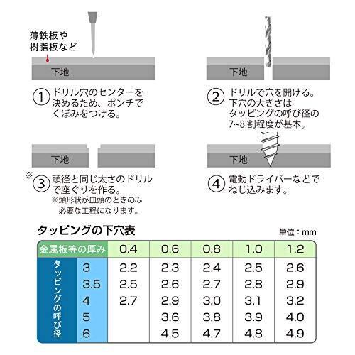 頭部が薄く、干渉しにくいタッピングねじ! 薄い部材の留めつけでも、頭が飛び出さない。 皿もみ(頭が飛び出ないように部材に皿穴を作ること)ができないところや、厚みが邪魔になる箇所に適しています。 加工の手間なく、見た目すっきり。 頭部高さ:1.0㎜