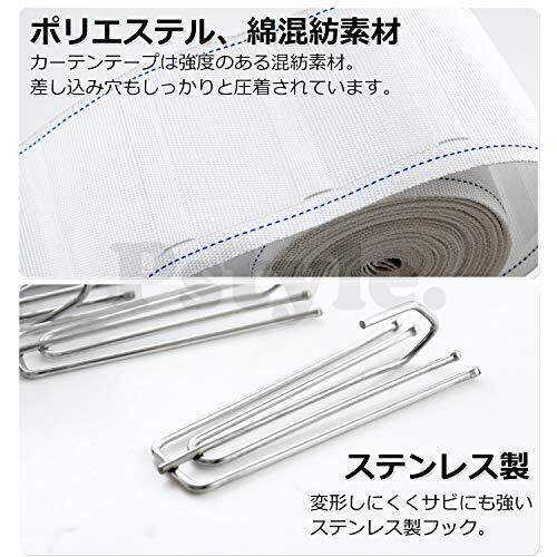 【普通の生地がカーテンに早変わり】 生地の柄や色が気になっていて、カーテンにできたらかわいいのにな・・と思った事はありませんか?Pstyle.カーテンテープセットを使うと、どんな生地でもカーテンに早変わり!生地にまっすぐ縫い付けるだけで簡単にお気に入りのカーテンを作れます。 【オリジナルのプリーツカーテンを作る】 生地に縫い付けてフックを差し込むだけと簡単にオリジナルカーテンを作ることができます。カーテンテープには表裏と上下があります。フックを差し込む穴がついている面を表にし、穴が空いている側を下にして縫い付けてください。 【プリーツのボリュームも変えられる】 4本すべてのピンを差し込んだり2本だけ差し込んだりする事で、プリーツのボリュームを変えることができます。 【ポリエステル、綿混紡素材】 カーテンテープは強度のある混紡素材です。差し込み穴もしっかりと圧着されているため、安定して取り付けができます。フックはステンレス製のため、変形しにくくサビにも強いです。 【仕様】 幅:約7.3cm。 長さ:約6m。 差し込み穴:4cm間隔。 パッケージ内容:カーテンテープx1、フックx30。