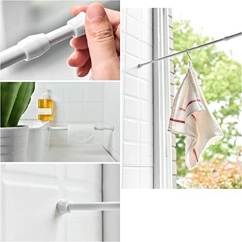 【サイズ】幅55~90【取付幅】60~110cm【パイプ径】1.3cm 【耐荷重】1kg ホワイト 【材質】ビニール 【設置簡単】つっぱり式なのでお部屋を傷つけない。賃貸住宅にも使えて、女性でも簡単に設置が出来るのれんレールです。くぎ・ネジ ・パンチを使わず、突っ張るだけで簡単に取り付けられます。 【伸縮タイプ】ポールの長さは60~110cmまで対応の伸縮タイプののれんレール。 【使用場合】つっぱり棒、クローゼットロッド、浴室用タオル掛け、室内用カーテンロッド、シャワーカーテンロッド、布団干し、物干し竿、キッチン用品収納