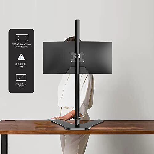 【仕様】VESA:75*75MM/100*100MM 対応モニターサイズ:17-32インチ ポール直径:35MM ポール長さ:1200MM 最大耐荷重:10KG 【角度調節】±10°上下傾斜&±45°左右回転&360°回転。モニター位置を上下調節可能!活動範囲が広くて便利です。どんな姿勢でも液晶画面が見れて、目の疲れを軽減でき、作業効率が上がります。長時間座った後は、立ち上がって仕事をすることもできます。 【ケーブル管理】ケーブルガイドが付き、デスクをきれいにします!空間が節約でき、素晴らしい視覚体験をさせます。 【安定性良い】高品質の冷間圧延鋼がコア材料で、最大耐荷重は10kgです。頑丈で耐久性のあるモニタースタンドを提供します。ゴム製の滑り止めの足が傷から保護します。 【取付簡単】付必要な部品が全部揃っていて、日本語取扱説明書も付属され、壁や机に穴を開ける必要はありません。モニタースタンドを簡単に取り付けられます。※ナット・ネジ類などの備品は備えていますが、万が一必要な部品が不足していた場合はカスタマーサービスにご連絡くださいようお願いいたいします。