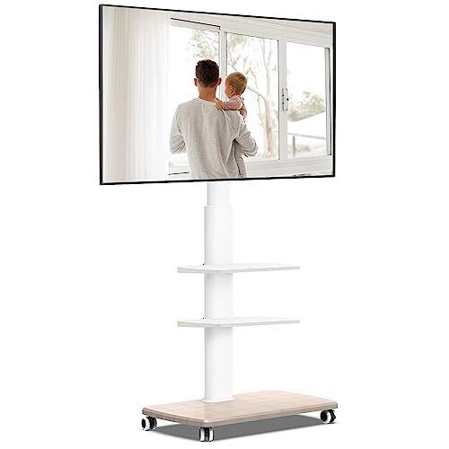 FITUEYES テレビスタンド 32~70型対応 キャスター付き 高さ角度調節可能 移動式 木目調 ホワイト 中段棚二枚付 棚板無階段調節 TT306504WW