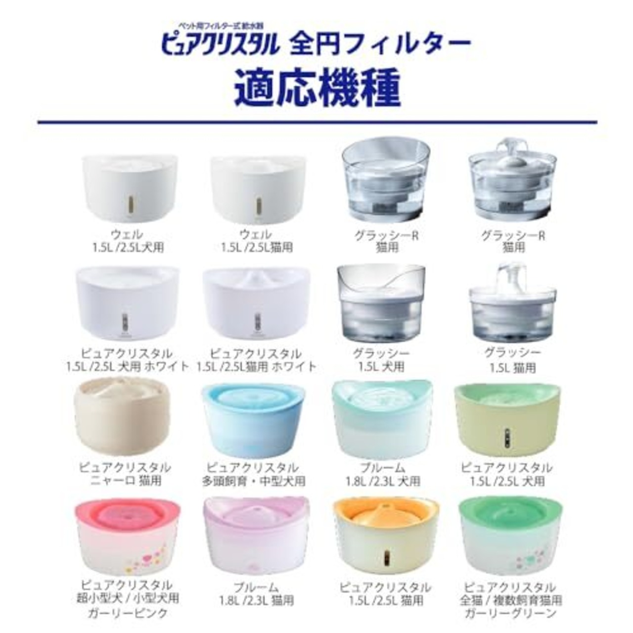 りんごの香りで息スッキリ!お口すこやかフィルター ピュアクリスタルでカンタン口臭ケア! リンゴポリフェノール&カテキン配合。抗菌セラミックボールでフィルター内を清潔に保ちます。すっきりとしたりんごの香りで口臭を低減します。ピュアクリスタルで水をたくさん飲むことでお口の汚れを洗い流し、口腔内の潤いを保ち、清潔な状態をキープします。 <内容量>2個(約2ヶ月分) <適応機種>ピュアクリスタル ウェル・ニャーロ・ピュアクリスタル1.5L/2.5L・グラッシーなどの全円タイプのフィルターを使用するピュアクリスタル ※使い始めは水がやや黄色くなりますが、これは溶出したポリフェノールによるものであり、品質に問題はございません。また、徐々に水につく色が薄くなりますが、効果に影響はございません。 ※フィルター式給水器ピュアクリスタルには、純正ピュアクリスタル専用フィルターをご使用ください。純正品以外を使用した場合、ろ過能力を十分に発揮できない可能性があります。GEXピュアクリスタルブランドの純正フィルター以外をご使用の場合、フィルターとしての性能はもちろん、本体の構造と一致せず、汚れを取り除く機能が著しく損なわれます。他社製フィルターをご使用の場合、性能の保証及び不具合発生による対応は致しかねます。必ず、純正フィルターをご使用ください。