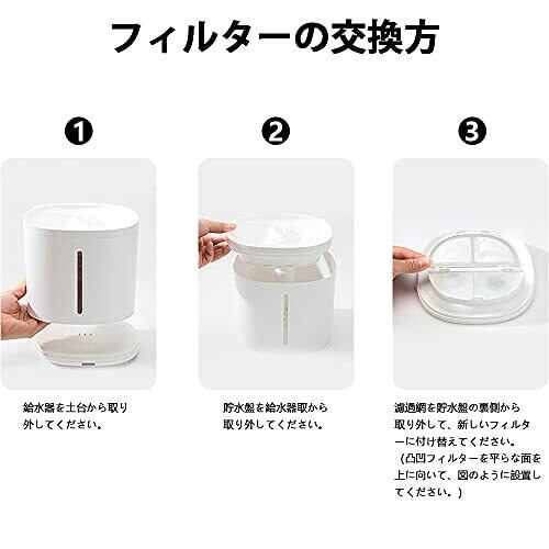 【機能】変な味や臭い、汚染物を除去できる交換式の活性炭フィルターは水を常にきれいにして、水あかや雑菌などは残さない!多くなった水合物による尿路感染症、腎臓疾病等々を未然防止し、ペットに健康的で衛生的な流れ水を提供するのを助けます!フィルターの効果を保証するため、1〜2か月ごとにフィルターを交換することをお勧めします。 【ご注意】フィルターのお手入れの際には、洗剤を使用しないで、水で表面の汚れを洗い流してください。フィルター交換時には、清潔を保つために必ず給水器本体各部を洗浄してください。