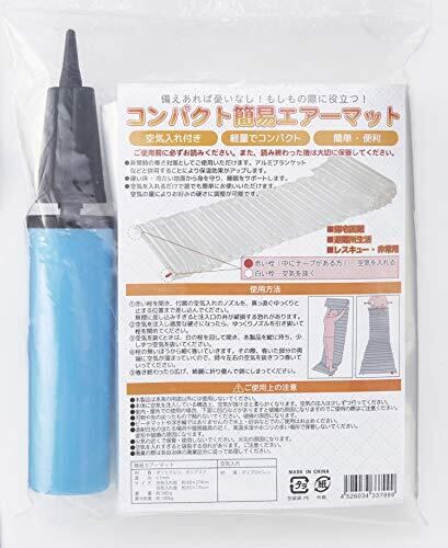 災害時用エアーマット エアーポンプ付き 195cmのロングタイプなので長身の方でも安心 横になっても痛くないだけでなく床からの寒さを防ぎます サイズ:収納時 約20×26cm 空気入れ後 約65×195cm 材質:ポリエチレン、ポリアミド 重量:380g 付属品:空気入れ