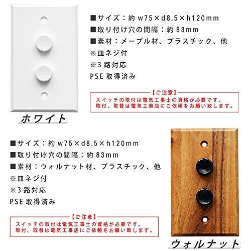 【※ご購入の前に※】スイッチの取付は電気工事士の資格が必要です。取付、取替は電気工事店にご依頼をお願い致します。 温かみのある木製のプレート2プッシュスイッチ。お部屋を無機質にさせないこだわりのデザインです。シンプルでスタイリッシュな四角型は、様々なインテリアに合わせていただけます。 既存の壁埋込み型スイッチからも付け替えやすい、平らなプレートタイプです。壁に開いている穴のサイズと商品が同じ大きさであれば、穴を埋めたり隠す工事をしなくても設置できます。(事前にご確認ください) 【サイズ】約w75×d8.5×h120mm、取り付け穴の間隔約83mm【素材】ホワイト:メープル材、プラスチック、他 【仕様】WB-12 トグルスイッチ定格/定格電圧:125V/定格電流:6A/推奨電線:VVF1.6mm2以上/3路対応/PSE取得済み