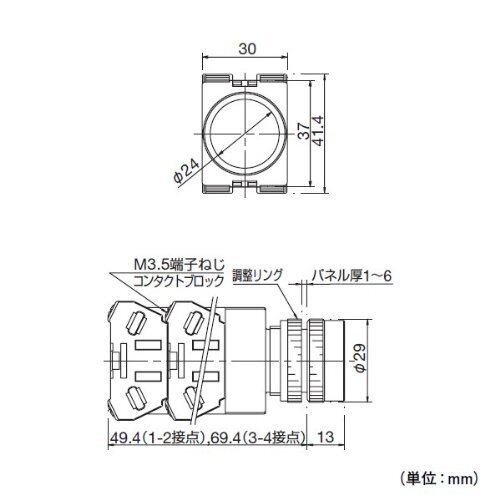 シリーズ : TWシリーズ 押ボタンスイッチ・製品シリーズ : TWシリーズ・RoHS対応状況 : 非含有 本体形状 : 一体形・取付穴寸法/取付形状 : φ22・ベゼルサイズ : その他 操作方式 : 押ボタンスイッチ・操作感 : ヘビー・動作方式 : モメンタリ形・操作部形状(1) : 丸形・接点構成 : 1a・接点材料 : 銀接点・操作部形状(2) : 平形 ボタン色/照光色 : 黄(Y) 保護構造 : IP65・端子形状 : ねじ(M3.5)
