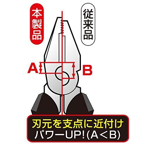 切る、曲げる、つかむ 少ない力で切断 テコ原理でパワーアップ 日本製 切断能力:鉄線 φ1.6mm、軟鉄線 φ2.6mm、銅線 φ3.2mm、VVF線 φ1.6mm×3芯 材質:本体 ハイカーボン特殊鋼、グリップ TPR(二重成型) 熱処理:本体 全体焼入、刃部 高周波焼入 硬度:本体 HRC42~50、刃部 HRC58~64