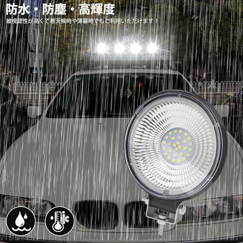 【製品詳細】LED作業灯 ✦サイズ:11×11×1.5cm(M6) ✦発光色:ホワイト ✦タイプ:丸型 ✦素材:航空アルミ合金ボディー+28連LEDチップ ✦消費電力:84W ✦電圧:DC12V~24V ルーメン:8000LM ✦入数:2個セット 【さまざまなシーンで活躍】ワークライト・作業灯は、さまざまなシーンで活躍します。 重機やトラックの荷台に取り付けて、手軽に現場を明るく照らすことも可能。 また、夜間に車やバイクの整備をする時も、ガレージに設置すれば全体を明るく出来ます。 車用のガレージや建設現場など、自分が使いたい環境に合わせてさまざまなシーンで使えて便利です。 【耐熱設計、優れる放熱性】本体に酸化防止処理された航空アルミ合金を採用、高温にも耐えられる非常に優れた耐熱性・放熱性を実現。アルミ柵式放熱システムにより、熱をより速く消散させます。さらに外部からの働撃を緩和できます。使用寿命は50000時間以上が実現します。 【色ムラが無い昼光色で作業がしやすい】超高輝度84Wパワーの作業灯なので、28連LEDチップを搭載、普通のLEDライトより、2倍以上の明るさを実現します!色ムラが無いホワイト発光で8000ルーメンに達します。ステーによって180°の照射角度を調節できて、照らしたい部分をピンポイントに狙ってしっかり明るくしてくれます。 【IP67防水・防塵機能】雨風や砂塵などの厳しい環境にも耐えるIP67防水・防塵性能を備え、雨に濡れてもこちらのLED作業灯が点灯しなくなることもありませんし、錆びることもありません。防水機能がしっかりしたタイプで、釣り・登山でヘッドライトを使う場合に突然の雨がふっても慌てることはありません。
