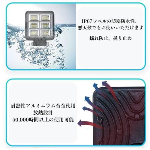 広範囲に照射可能な強力なLED作業用ワークライト。2個セットで多様な場面で活躍できます。 【高輝度】非常に明るく、軽量かつコンパクトな広角&拡散型設計(拡散レンズ)により、各ワークライトは3000ルーメンの明るさで広い範囲を均一な光を照射。純正な白光は屋外の夜間照明に適しています。 【優れた耐熱性とIP67レベル防水】アルミニウム合金、航空機素材を使用し、耐熱性が高く、軽量です。さらに、空気との接触面を増やし、効果的な放熱設計としており、長寿命の照明を実現し、50,000時間以上の使用が可能です。IP67レベルの防塵防水性能を持ち、悪天候でもお使いいただけます。 【爆光モード】特に非常に明るい光が必要な時は、爆光モードを活用でき、144Wのパワフルな出力で、迅速な照明が可能です。 【幅広い用途】12V/24V兼用タイプですので、自動車、夜のバーベキュー、建設現場、倉庫内の照明、農業、除雪車のライトなど様々な場面で活躍できます! 【製品仕様】●ワークライト2個セット ●適合車種:12V/24V兼用 ●動作電圧:DC9V-36V ●サイズ:106×106×28mm ●重量:166g