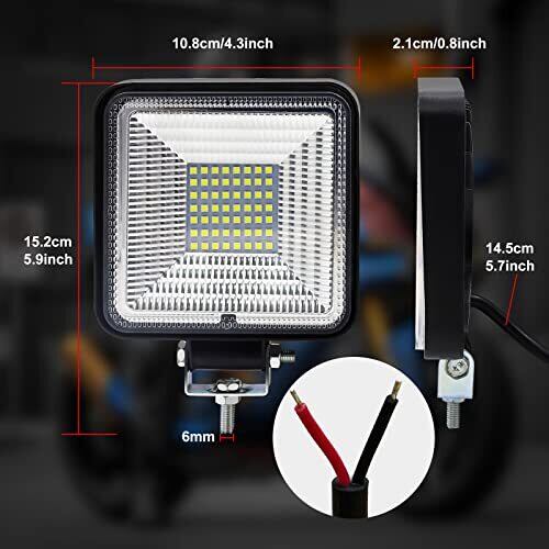 【製品詳細】LED作業灯 ✦サイズ:10.8×10.8×2.1cm(M6) ✦発光色:ホワイト ✦タイプ:方形 ✦素材:航空アルミ合金ボディー+56連LEDチップ ✦消費電力:168W ✦電圧:DC12V~24V ルーメン:8000LM ✦入数:2個入り 【さまざまなシーンで活躍】ワークライト・作業灯は、さまざまなシーンで活躍します。 重機やトラックの荷台に取り付けて、手軽に現場を明るく照らすことも可能。 また、夜間に車やバイクの整備をする時も、ガレージに設置すれば全体を明るく出来ます。 車用のガレージや建設現場など、自分が使いたい環境に合わせてさまざまなシーンで使えて便利です。 【耐熱設計、優れる放熱性】本体に酸化防止処理された航空アルミ合金を採用、高温にも耐えられる非常に優れた耐熱性・放熱性を実現。アルミ柵式放熱システムにより、熱をより速く消散させます。さらに外部からの働撃を緩和できます。使用寿命は50000時間以上が実現します。 【色ムラが無い昼光色で作業がしやすい】超高輝度168Wパワーの作業灯なので、56連LEDチップを搭載、普通のLEDライトより、2倍以上の明るさを実現します!色ムラが無いホワイト発光で8000ルーメンに達します。ステーによって180°の照射角度を調節できて、照らしたい部分をピンポイントに狙ってしっかり明るくしてくれます。 【IP67防水・防塵機能】雨風や砂塵などの厳しい環境にも耐えるIP67防水・防塵性能を備え、雨に濡れてもこちらのLED作業灯が点灯しなくなることもありませんし、錆びることもありません。防水機能がしっかりしたタイプで、釣り・登山でヘッドライトを使う場合に突然の雨がふっても慌てることはありません。
