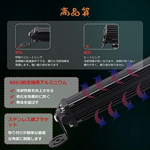 ☁【特別なビーム】この製品は7インチのLED作業灯ライトバー です。先進のLEDチップと投光器を組み合わせたもので、高輝度を実現するとともに、ランプの反射板を内蔵しているため、光の照射角度を広げることができ、お客様に高品質の体験を提供します. ☁【高品質】硬くて軽量なアルミ合金製で、破裂・着用が容易ではありません。自然環境では、アルミニウム合金は酸化皮膜を形成する可能性があるため、湿気の多い環境で強力な耐食性を備えています。密閉性が良いので、雨でも雪でも、あらゆる天候で使用できます。防水・防塵・耐衝撃の効果が良い。 ☁【優れた放熱性】高い素材を使用し、裏面のストライプ柄が多いので放熱面積が広がります。長期間の高温条件下でも、優れた冷却効果を発揮します。 ☁【簡単的な取付】本製品は、小さな取付金具やネジ、溝のデザインが豊富なため、簡単な設置と自由な角度です。 ☁【広い適用範囲】SUVやトラックのフォグランプ、自動車の荷台用の照明、フォークリフトのライト、除雪車のライト、海苔漁の常夜灯、夜釣りの照明、漁業用、農業機械用、建設機械等作業に、災害時の備えに、交通整理に、工事現場に様々な場面で活躍できます。