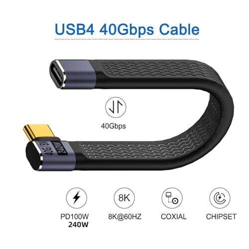 cablecc USB4 40Gbps 延長ケーブル スリム フラット オス-メス 240W電源 8K@60Hz ビデオ 直角 13cm