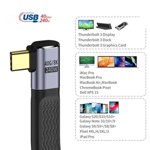 90°角度タイプ ポート周辺のスペースが限られていてもメスポートに接続できます。 1) 幅広い互換性:このUSB4 Type-Cケーブルは、ほとんどのUSB-Cデバイス (主にノートパソコン) と広く互換性があります。Thunderbolt3との下位互換性があります。また、ハードドライブやドッキングステーションと接続してデータを得ることもできます。 2) 8K/5K Ultra HDビデオ出力: このUSB4ケーブルは、USB4またはthunderbolt3/4ポート搭載デバイスからUSB-Cモニターまで延長できます。シングル8K@60hz、5K@60Hzまたは4K@60Hz最大60Hzに対応。 外部ディスプレイのビデオ解像度。 (お使いのモニターのType-cポートがビデオ用DP代替モードをサポートしていることを確認してください。) 3) USB4.0 最大40Gbpsデータ転送レート:このUSB4ケーブルはデータ転送速度を最大40Gbpsに達し、転送速度はThunderbolt3の2倍の速度です。 4) 実用的な140W/100Wの電力供給: このUSB 4ケーブルは最大140W/100Wの充電に対応し、USB-Cデバイスが使用されているときに電力を供給します。