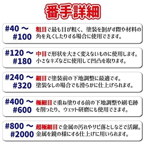 【商品説明】マジック式 サンドペーパー ディスクサンダー用 穴なし 100枚セット です。サイズは100mm、125mm、粗目から極細目まで各15種類の番手があり種類も豊富です! 【多用途で活躍!】木材や金属、プラスチックなどの下地研磨、金属表面のならし、さび取り、木工仕上げ、塗装下地の目荒らし、パテの研磨、塗膜の剥離、サーフェーサー、汚れ落とし、ペンキ剥がし等に最適です。 【商品仕様】マジック式なので装着、脱着とも簡単です。交換手間がかからず、簡単に装着・脱着できます。 【詳細】強靭な砥粒と丈夫な紙質で耐久性に優れます。 【注意事項】本製品は、耐水ではありません。