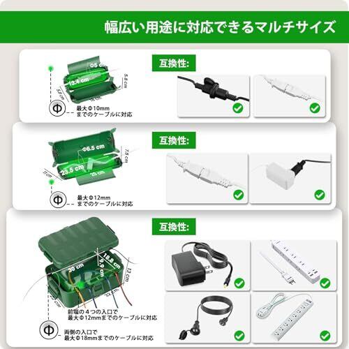 延長コード安全カバー: ロック ラッチx4、ケーブルクランプx2、取り付け穴x2、ケーブルタイx2、防水性と密閉性を確保し、屋外と屋内の電気接続を乾燥させて安全に保ちます。どこにでも簡単に設置して吊り下げられます。 外寸: 18 L×5.8 W×5.8 H cm 内寸:13.4 L×5.0 W×5.0 H cm 重量:約100g。Φ1-10mmまでの幅広い電線、フラットケーブル、編組電線に使用できます。 防水防塵:IP44防水、両端ゴムシール、防水、雪、雨、防塵などがあります。屋外のランプストリング、景観照明、クリスマスや他の休日の装飾を保護するために最適です。 耐候性: 工業グレードの材料で構成され、耐久性と耐紫外線性に優れ、激しい衝撃と強度に耐えられるため、屋外の過酷な環境で使用に最適です。 使いやすい: インストール不要、トップカバーと4つのラッチで簡単に開けられ、中に接続部を入れ、ケーブルクリップでコードを固定し、ロックして密閉します。