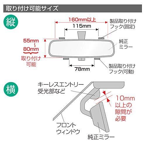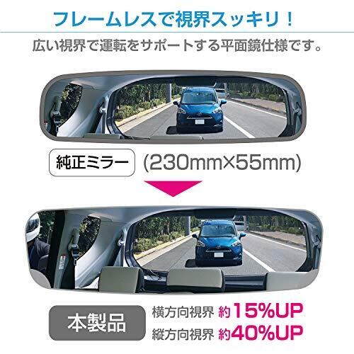 【スタイリッシュなフレームレスミラー】鏡カット面を特殊加工によりラウンド形状にすることで実現したスタイリッシュなフレームレスのルームミラーです。 【フチがないシンプルな平面鏡ミラー】純正ミラーと同じ自然な距離感を確保した平面タイプ鏡です。 【旧モデルからの改良リニューアル】旧型製品から約26%の軽量化が実現。純正ミラーにフィットするデザインに一新した設計となっています。 【取り付け背面も改良】背面の固定フックとスライドフックの配置を変更したことで、軽自動車のNBOXなど後席シートベルト警告灯がついている純正ミラーにも対応しています。