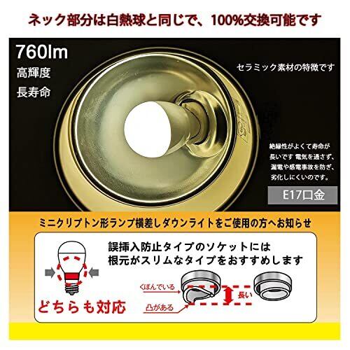 誤挿入防止タイプのソケットには根元がスリムなタイプをおすすめします。ネック部分はスリムなミニクリプトン電球同等形状を実現(外径:35mm/長さ:70mm)。〈ネック部 : スリムタイプ〉根元がスリムだから奥まで届く。 口金:E17 / 光色:電球色相当 2700K 本体サイズ:外径35mm×長さ70mm 定格消費電力:5.2W、本体重量(kg):0.045 全光束 (ランプ単体の明るさ):一般電球60形相当 760 lm 配光角180度で広範囲を明るく照らす 密閉型器具対応