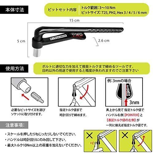 サイズ:幅2.6x高さ5x長さ15cm 重量:80g トルク範囲:3~10Nm ビットサイズ:T25,PH2,HEX 3/4/5/6 mm 付属:ビットセット6種類 トルクレンチの捻れを利用した簡易式トルクレンチ。 フレームやボルト部品の推奨トルク値まで 適切な力を加えて推奨トルク値まで締める為のツールです。 豊富な6種類のビットサイズを取り揃えたビットセット付き。 シンプルなグリップハンドルの軽量コンパクトなデザイン。 自転車/ロードバイク/MTBマウンテンバイク等のカーボンフレームや 推奨トルクのある場面で大活躍するツールです。