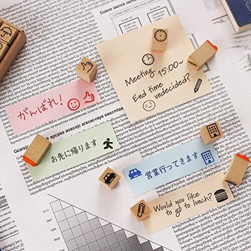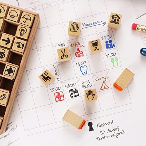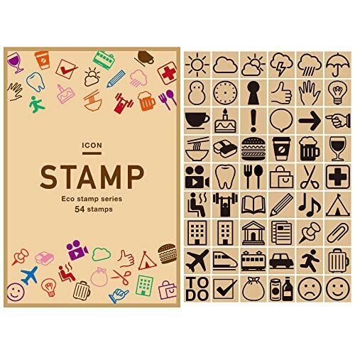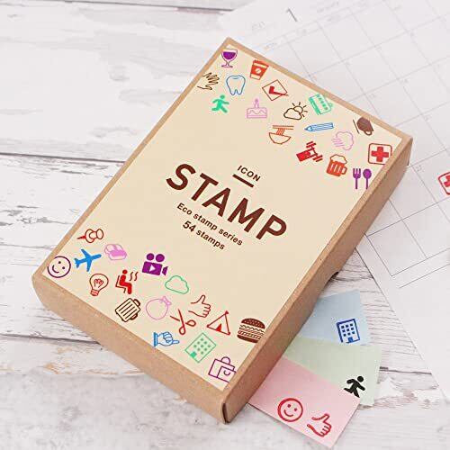 手帳などに便利なかわいい54個スタンプセット 小さなアイコンのスタンプがたくさん入っています 手帳で楽しくスケジュール管理、無地の付箋などもかわいく 天然ゴムと台には廃材などを使用し環境に配慮 パッケージは1個づつ収納ででき紛失を防げます パッケージデザインもおしゃれ、プレゼントにも