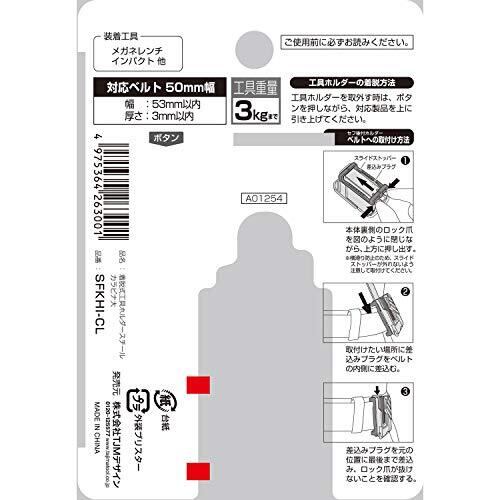 以下の情報は単品あたりの情報です。 用途:セフ着脱式工具ホルダー 素材:強度はアルミの2倍以上、ステンレス製 ベルトサイズ:幅53mm以内、厚み3mm以内 装着工具:インパクトドライバー(太軸インパクト)、メガネレンチ、他 換え用品:セフ後付ホルダー用スライドストッパーsf-chldst