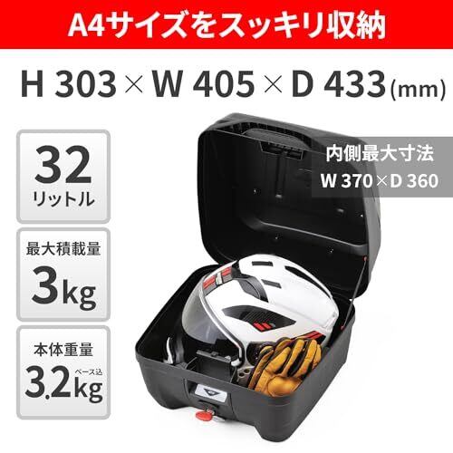 【用途】バイク用 リアTOPケース 【仕様1】GIVI モノロックケース 【仕様2】容量:32L、最大積載重量:3.0kg 【仕様3】サイズ(外寸):奥行433x幅405x高さ303mm 、総重量(ベースプレート込み):3.2kg 【商品構成】本体、汎用ベースプレート MP60N