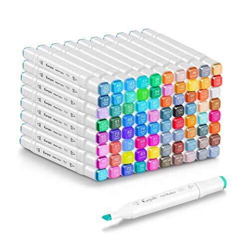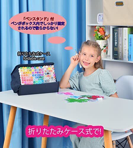 「120本アルコールマーカー」バージョン2022、2種類のペン先、高品質な染料インクを採用しています。発色が鮮やかで細かく描くことができ、定着性が強く、変色や退色も少ないです。普通の紙だけではなく、プラスチックカップや布やセラミックス、木製品などに塗ることができます。高品質のコットンコアを使用することで、よりスムーズに描くことができるようになりました。 「太細両用」太字(ブロードタイプ)は、:1-6mmのポリエステル芯。 「持ち運びに便利」付属のショルダーを取りつければ、2wayバッグとしてもお使いいただけます!折りたたみケース式で、机の上で30度折りたたむことができるので、キャップの数字が見えやすいです。 「速乾性に優れたアルコールマーカー」高品質なアルコール系のマーカーなので、時間が経っても色が薄くならず、明るく、耐水性・耐光性に優れています。インクの量が豊富なので、長くお使いいただけます。*インクが蒸発しないように、使用後はキャップを閉めてください。 「多用途」絵を描くだけではなく、様々なDIYツールとしても使用可能で、プロの方も水彩画等に使用いただけます。漫画、スケッチ、衣類、建築、プロダクトデザイン、119色のラージセットで、様々な用途にお使いいただけます。