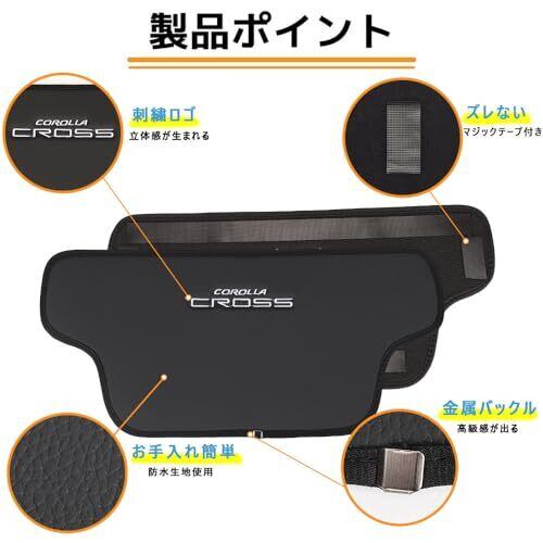 【車種専用形状】適合車種 トヨタ カローラクロス 10系(2021年9月~) 【肌触りのいいPVCレザー】ダブルステッチ縫製 ダブルステッチで縫製しますので、美しく見せるのみならず、強度も向上します。 こだわりの品質 高品質な低反発仕様のPUレザー贅沢に使用。高品質PUレザー採用して撥水性があるので、天然の革に比べると雨や汚れに強く、お手入れも簡単です。 【ガーニッシュ】エンブレムにも採用されます、黒いPUレザーと赤いPUレザーい糸が組み合わせて、車の高級感を損なわなく、内装の雰囲気とマッチします、お手軽いに想像以上のドレスアップ効果をもたらします。 【汚れ防止 蹴り防止】シートバックはパイル素材を採用するので、汚したり損傷したりすることは避けられません、掃除やお手入れが簡単ではありません。本製品は靴のプリント、ほこり、水などの汚れ目は、雑巾で拭い取るだけ、綺麗になりやすいです。 【簡単取り付け】 簡単取付 ワンタッチでの簡単取付だから、初めての方や女性でも装着でき、取り除くのも簡単。 ※装着される車種、箇所が同形状の採用車か現車を必ずご確認下さい。