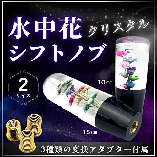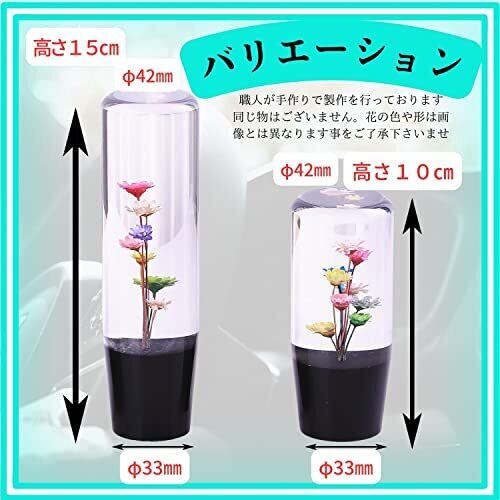水中花シフトノブは軽トラ、街道レーサー、デコトラ、高速有鉛、ハコスカ、ブタケツ、ケンメリなど、旧車や昭和レトロな雰囲気に抜群に合う水中花 シフトノブ ロング です。 クリスタルシフトノブなので光が当たるとキラキラと輝き、綺麗で幻想的な雰囲気が魅力的なシフトノブ水中花となっております。 握りやすい形状でイモネジで締め込むだけのねじ込み式なので、簡単に取り付けできます。お手軽に車内をカスタム、ドレスアップしてお楽しみください。 サイズはシフトノブ100㎜(10㎝)とシフトノブ150㎜(15cm)の2つをご用意しており、ネジ径はM12-P1.25で変換アダプターが3つ(M10-P1.50 / M10-P1.25 / M8-P1.25)付属しているので様々な車種に取り付けが可能です。 【適合性】トヨタ(M12mm-P1.25mm)、スバル(M12mm-P1.25mm)、スズキ(M12mm-P1.25mm)、ダイハツ(M12mm-P1.25mm)、ニッサン(M10mm-P1.25mm)、マツダ(M10mm-P1.25mm)、ミツビシ(M10mm-P1.25mm)、ホンダ(M10mm-P1.50mm)※汎用性のある社外品なのでサイズが合えばその他、トラックなどにも取付けできます。【注意】本商品は職人がひとつ一つ手作りしておりますので、二つと同じ物はございません、花の色・形は商品画像と違う物がある事を予めご了承の上お買い上げいただけますようにお願いいたします。